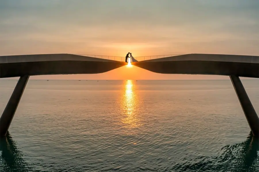 CẦU HÔN – KISS BRIDGE - điểm Check in hoàng hôn siêu lãng mạn của du khách không phân biệt độ tuổi, được Thế giới biết đến rộng rãi qua MV ca nhạc của các Ca sĩ nổi tiếng.. Quý khách có thể đứng từ bên bờ chụp toàn cảnh KISS BRIDGE khi ánh hoàng hôn vừa buông xuống